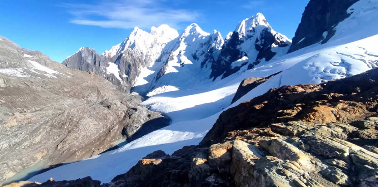 Después del desayuno, empezamos la caminata subiendo hasta llegar al paso Carhuac; que se encuentra a (4650msnm) es un ascenso muy fácil de aproximadamente 2 horas, luego descendemos hasta llegar al campamento donde se observa una vista hermosa con picos elevados que pasan los 6000msnm (Yerupaja, Siula Grande, Jirishanca Grande) y con una laguna muy hermosa y grande con vistas panorámicas, está considerado como el primer campamento más hermoso en el circuito Huayhuash. Luego el almuerzo. (Recorrido 9km – 4 a 5 horas). Fin del día.